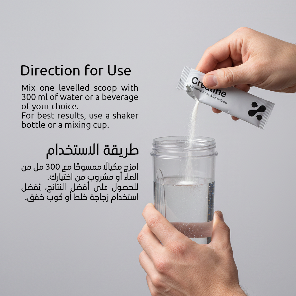 Mix 5g (one sachet) with water or a carbohydrate-based drink. Consume daily for sustained benefits. For improved creatine retention, take with a carbohydrate source.